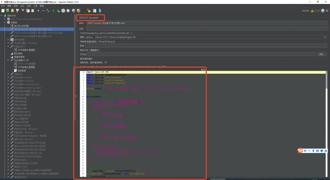 以下是JSR223 Sampler中使用的Groovy脚本,用于实现流式接口压测: