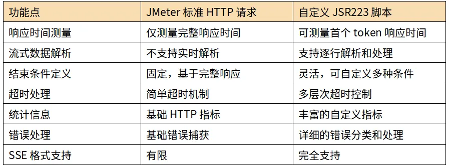 下表对比了JMeter标准HTTP请求组件与我们的自定义JSR223脚本在处理流式接口时的关键差异: