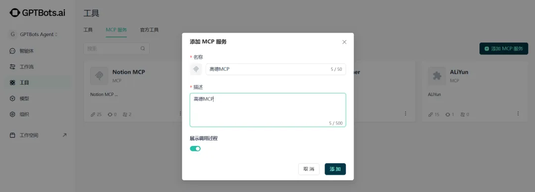 GPTBots通过MCP协议自动拉取该服务提供的 Tool 列表(工具发现)。