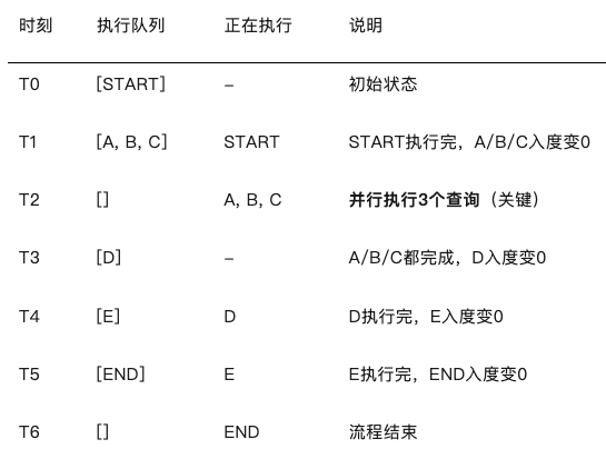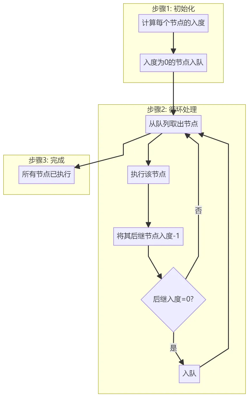 如果某个后继节点入度变为0,说明其前置依赖已全部完成,可以加入执行队列