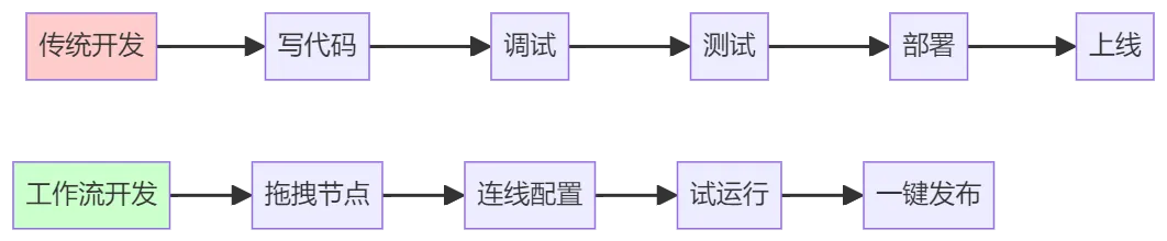 传统的自动化开发需要写代码、调试、部署,而工作流将这一切简化为"画布式编排":