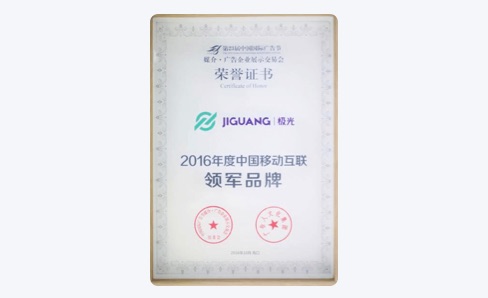 On October 01, 2016, Advertising Enterprise Exhibition and Trade Fair awarded JIGUANG the "2016 China Mobile Internet Leading Brand" Award.