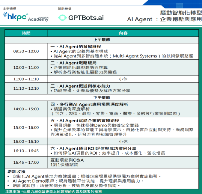 香港生产力局(HKPC)携手企业级无代码AI Agent平台GPTBots,再度推出“AI Agent驱动智能化转型”闭门课程。课程聚焦AI Agent在企业中的实际落地,开放交流,助力企业管理者与创新者共探智能转型新路径。