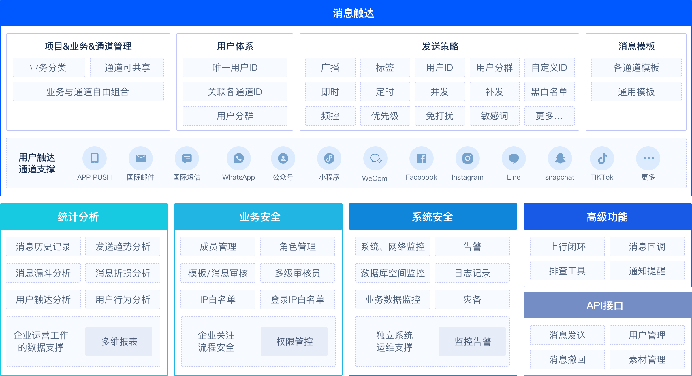 国际法律监管下的合规隐私安全;符合海外政策的数据采集等合规保障;符合海外敏感词、发送频次等消息合规保障