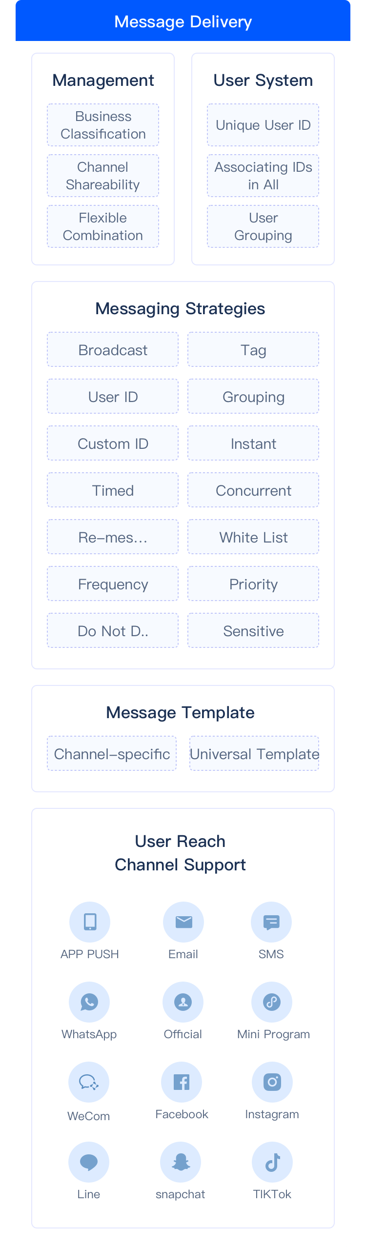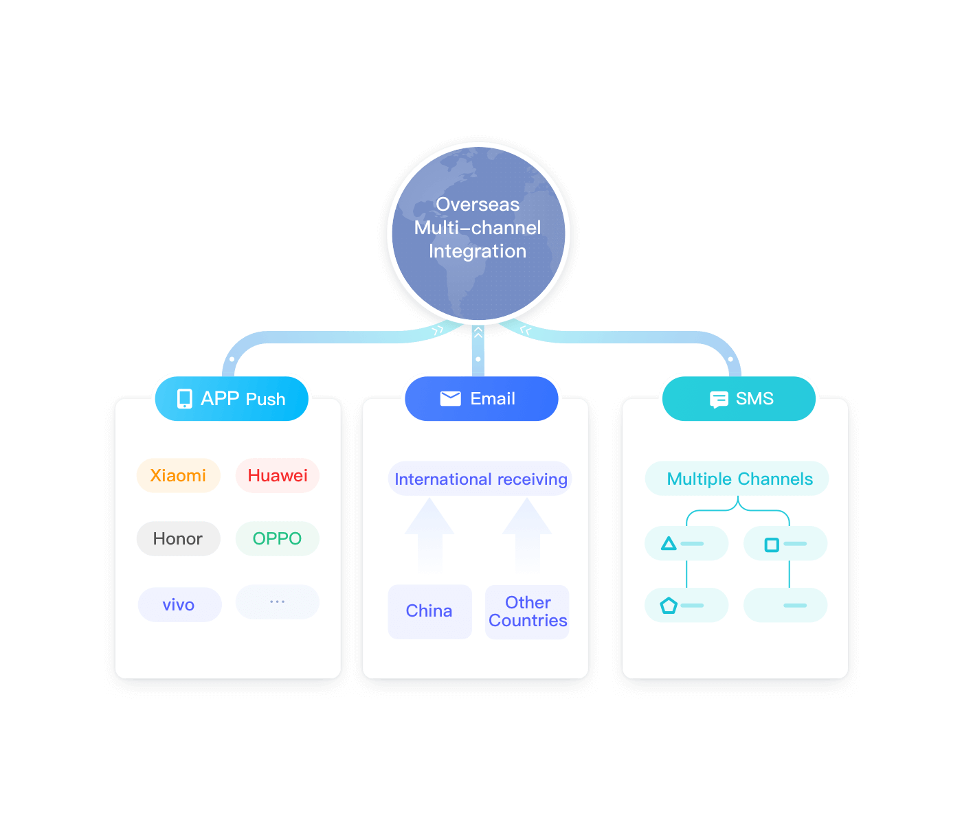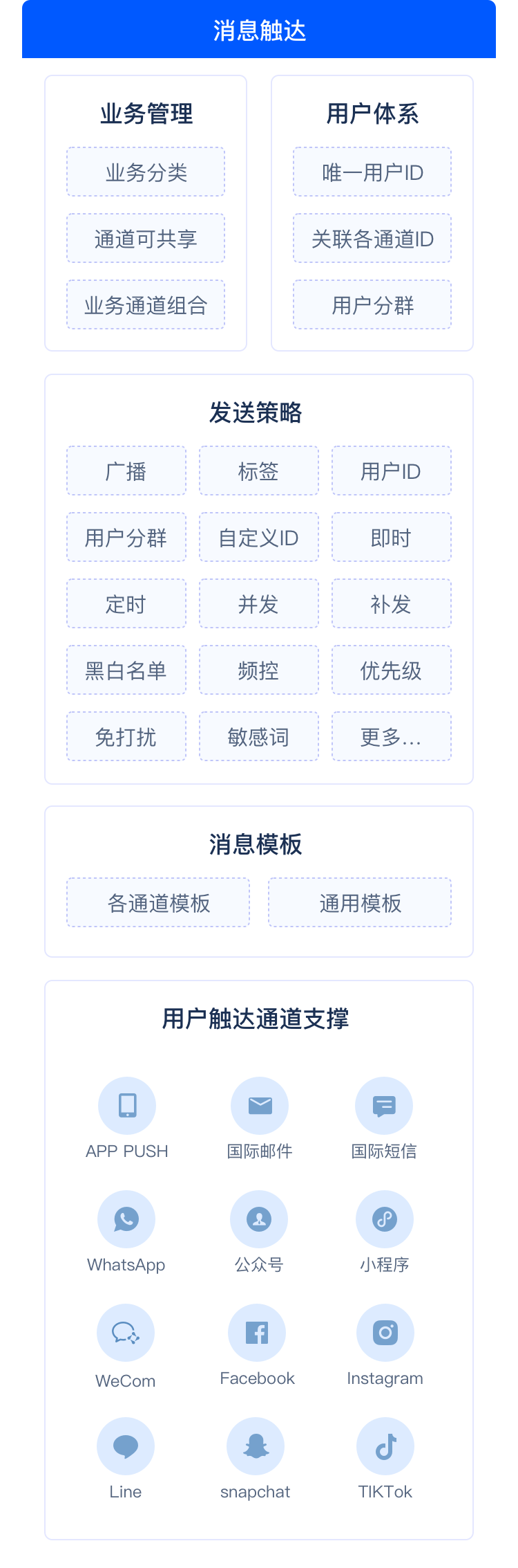 App Push 多手机机型适配、厂商通道对接难;短信、邮件、WhatsApp等多平台通道对接难;多平台独立开发成本高、运营效率低