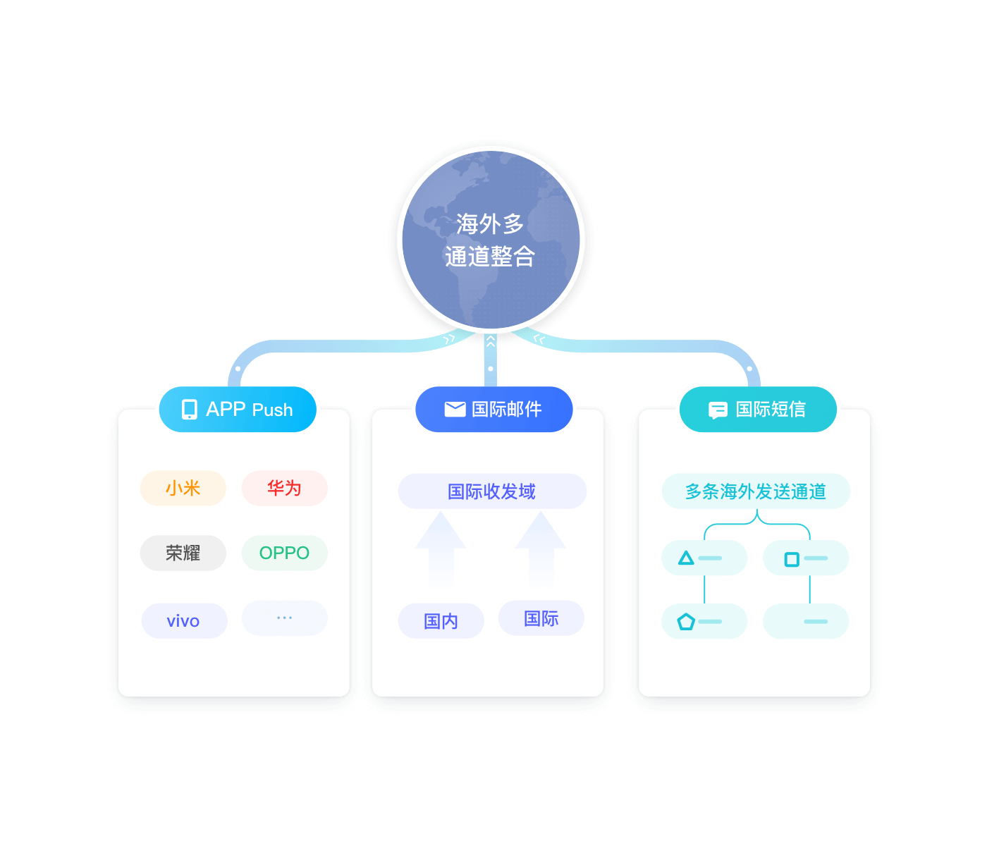 自建App Push、国际邮件、国际短信三大通道,同时覆盖多个海外消息通道: