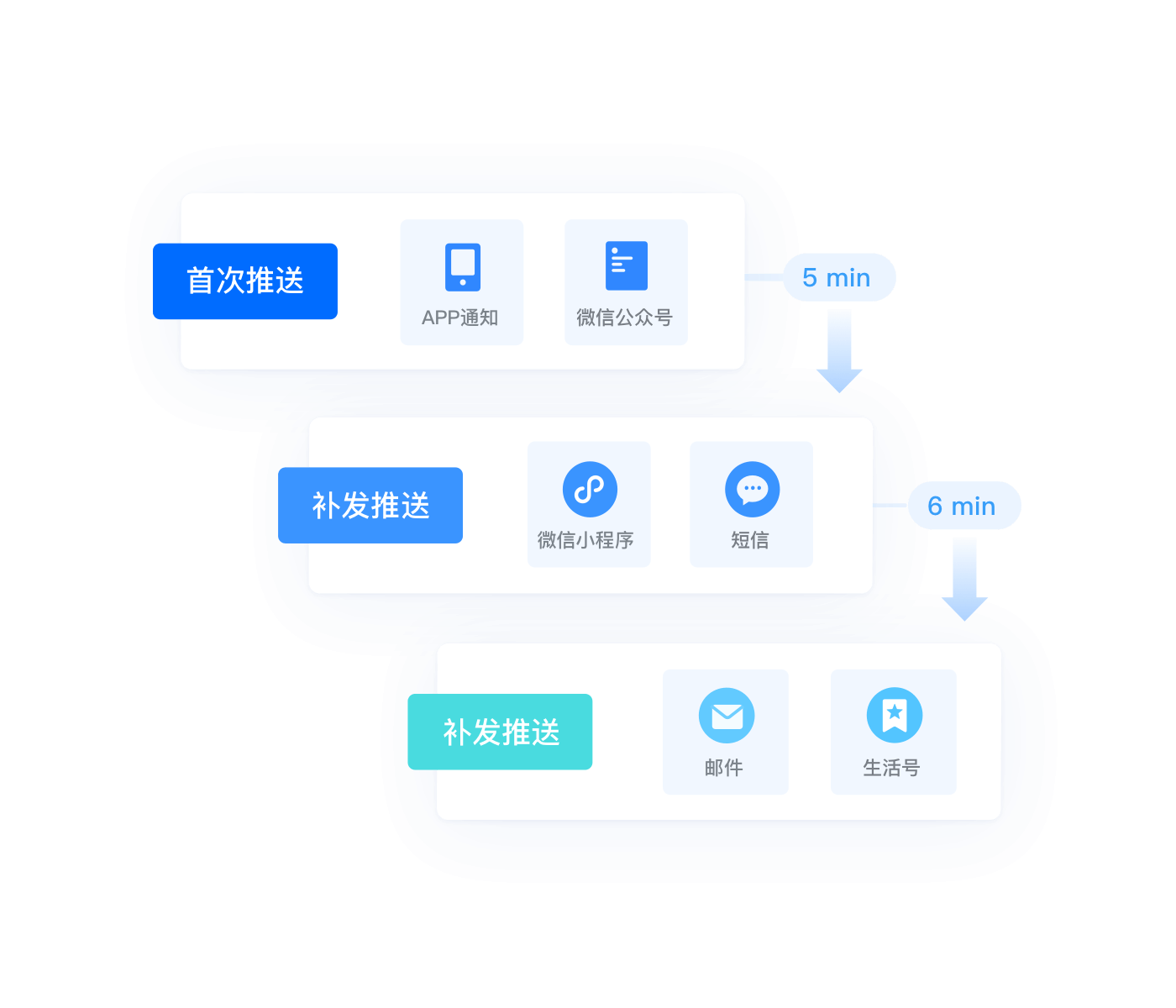 提供并发、补发、批量单推、定时发送等发送策略,并可对消息进行优先级、免打扰等设置,通过灵活的策略配置,降低消息的发送成本,提高用户触达效果。