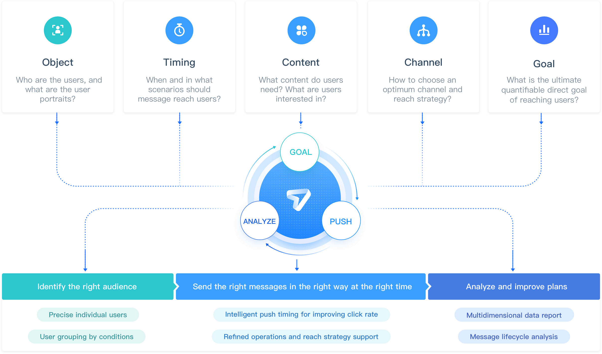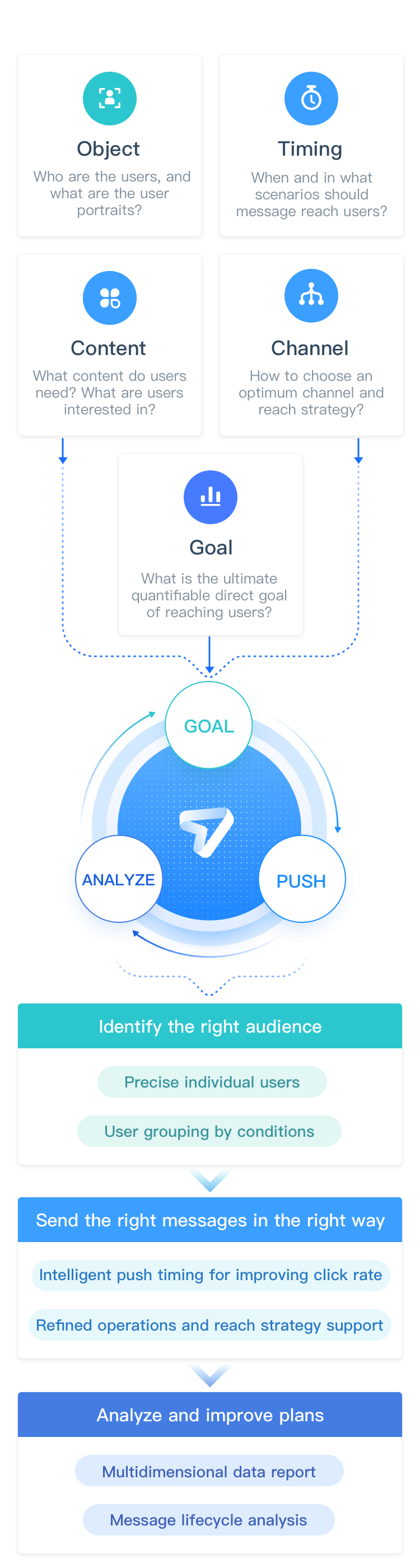极光推送帮助开发者对 合适的对象 ,在 合适的时机 用 合适的方式 发送 合适的消息 ,达成转化和活跃目标